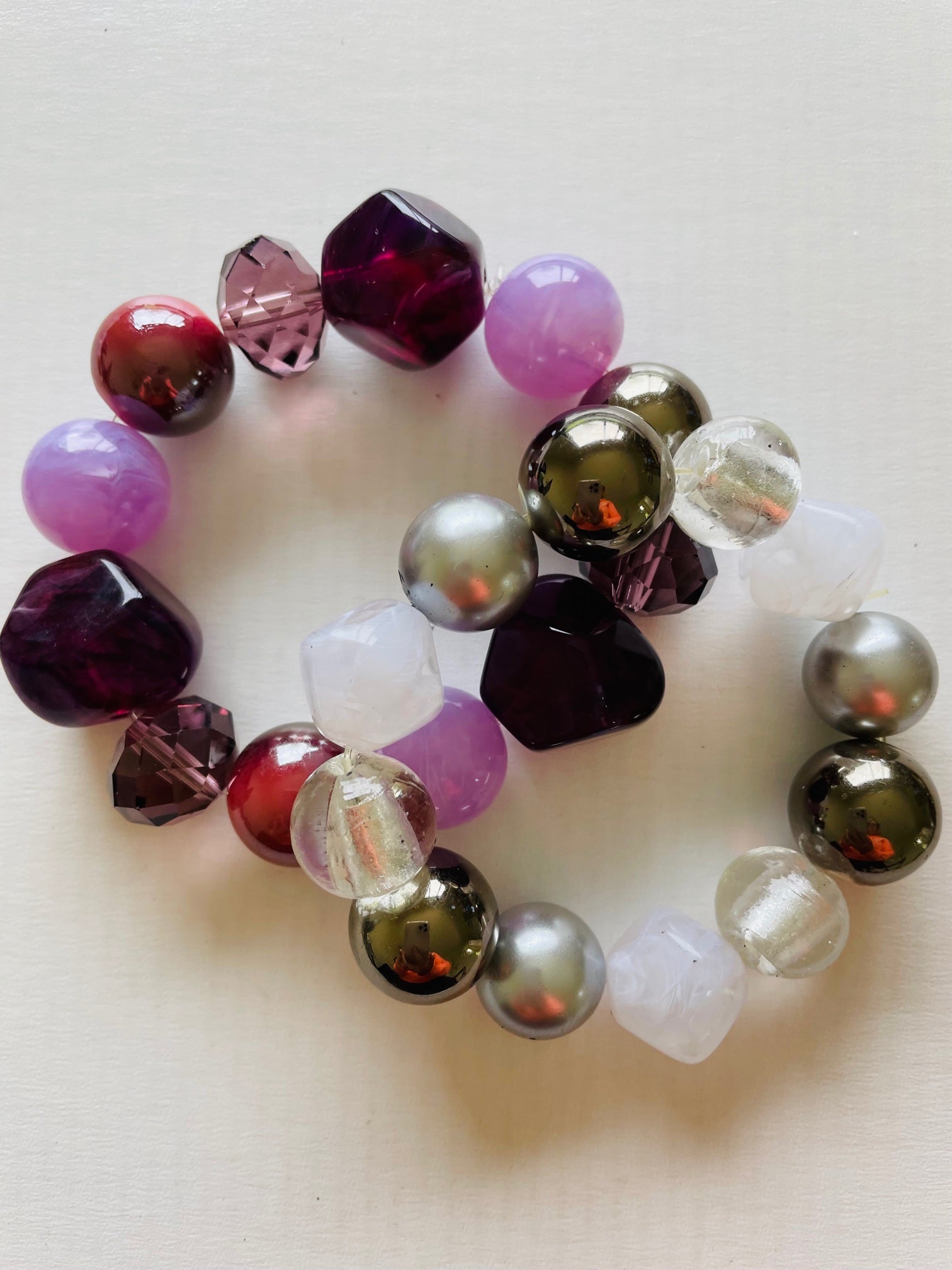 Chunky beads with varied shades of colour and texture. The bracelet is made from strong nylon so easy to slip on and off. The diameter of the bracelet is approximately 58 mm and will suit small to medium wrists.