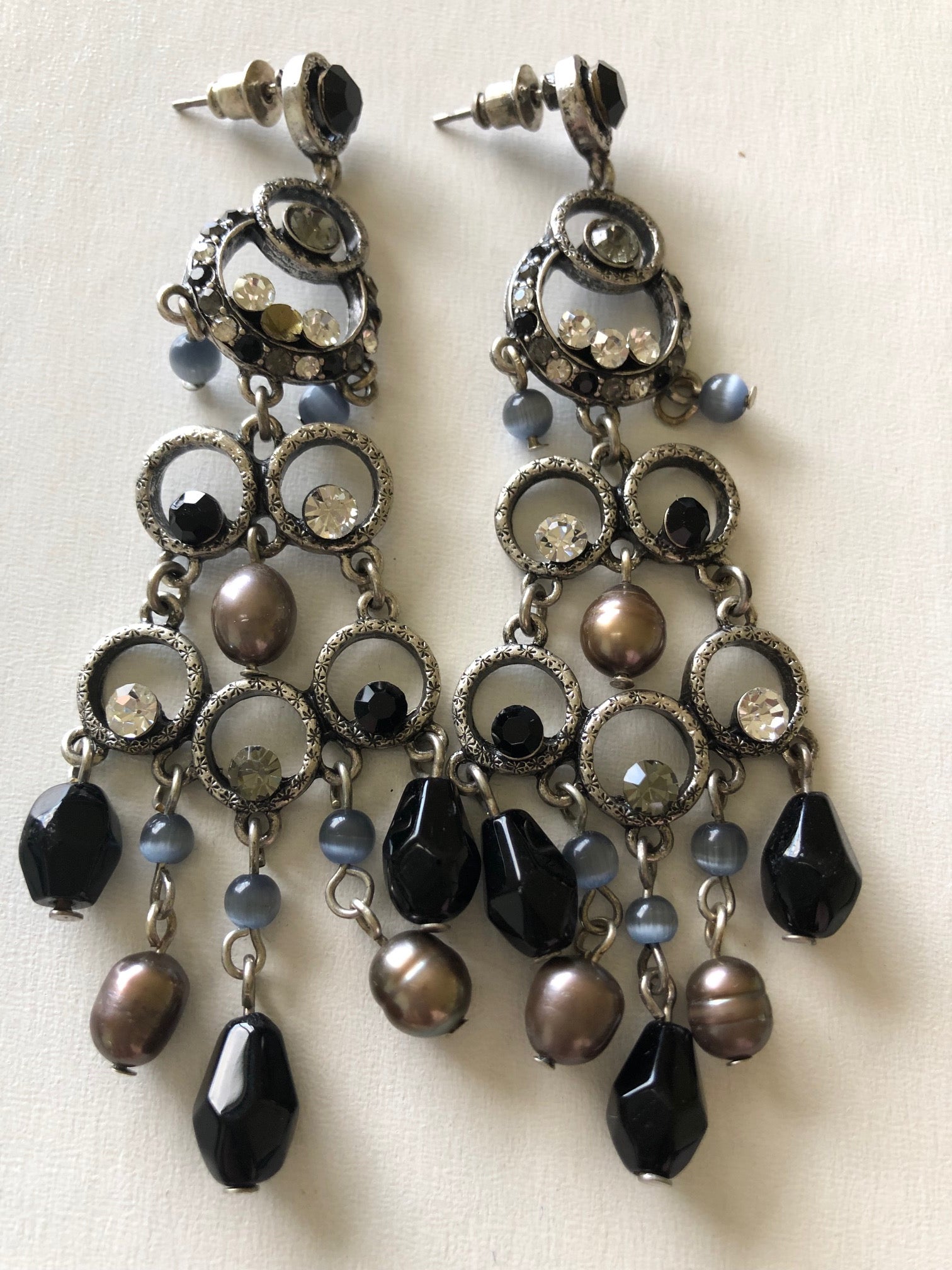 Elegant earrings made from colourful beads, pearls and clear crystals