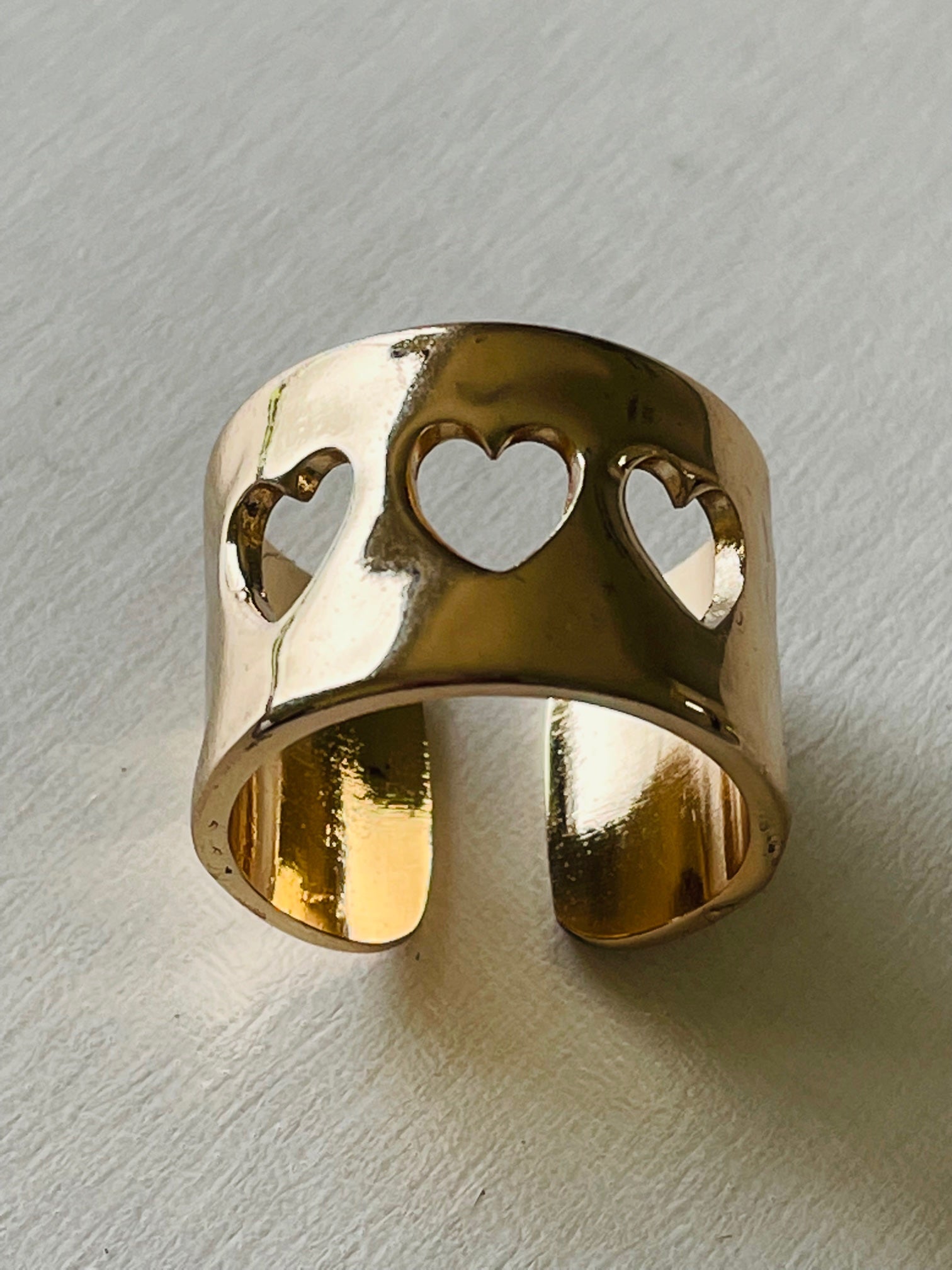 Stunning heart rose gold band,..... Adjustable ring made from quality nickel-free electroplated brass. Width of the ring is 15 mm and the diameter is 17 mm.