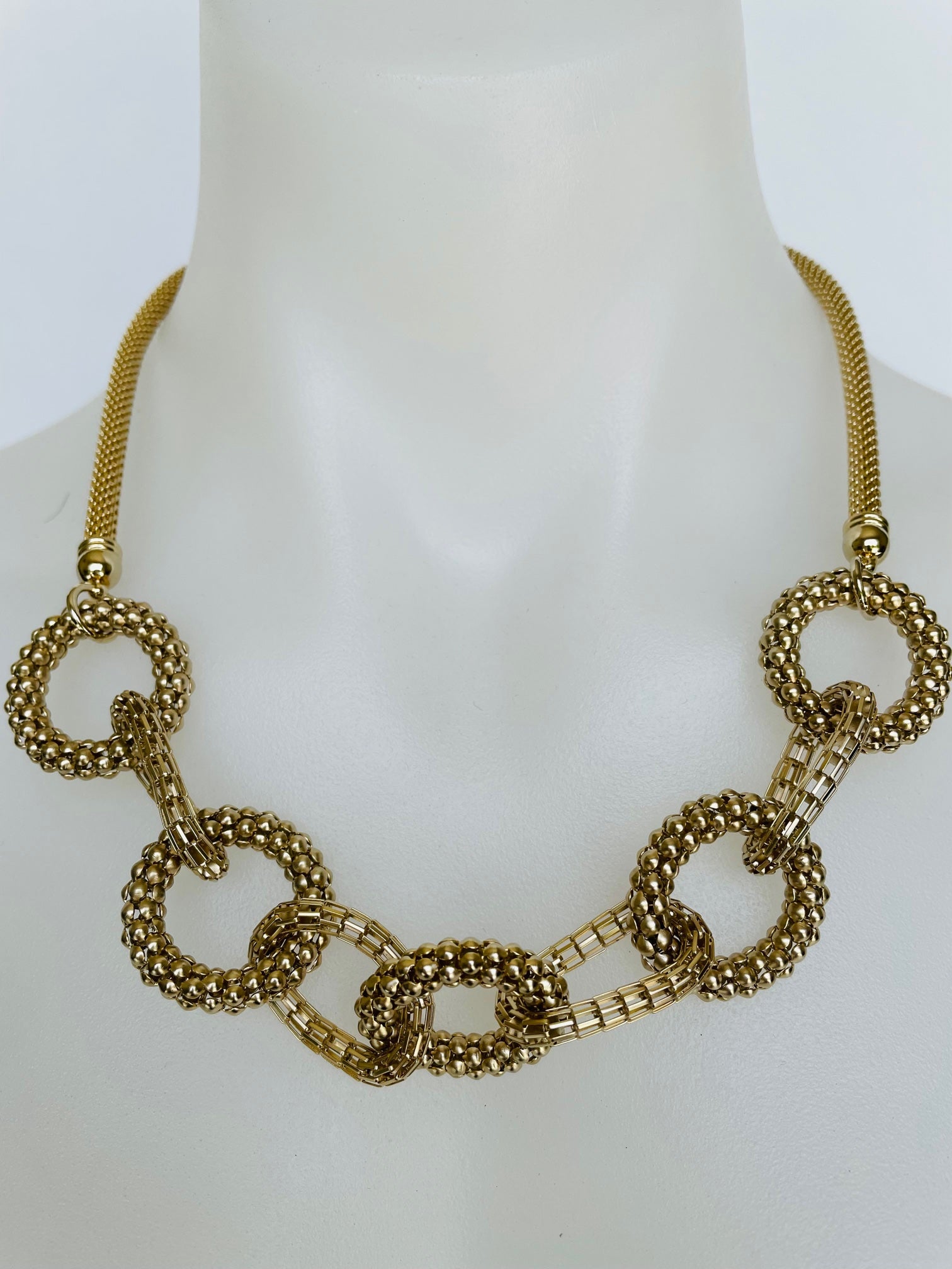 The stunning necklace has a solid meshed chain and has beautiful detail shapes as a centre. The circles are solid however the ovals are made from delicate chain links to make changing circular shapes.