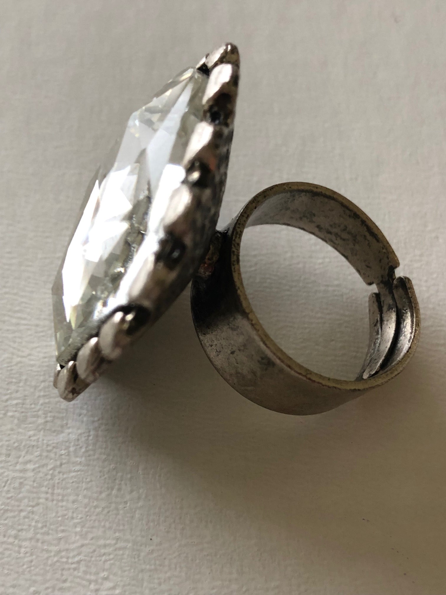 Beautifully detailed frill rim surrounding a large square crystal. The ring is adjustable and made from quality nickel-free electroplated brass. Width of crystal 30 mm, the height from the bottom base of the ring to the top of the crystal 29 mm. The ring size is adjustable.