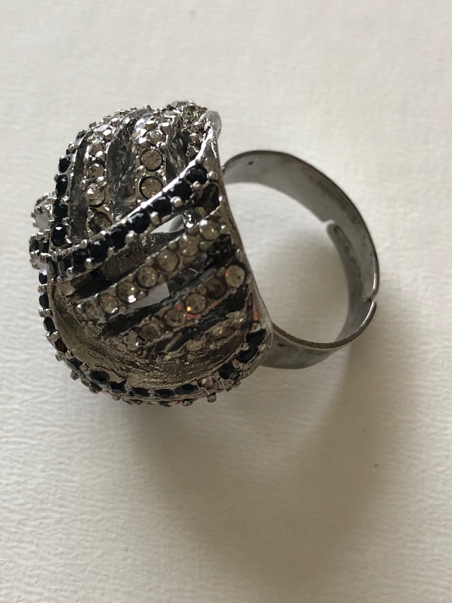 Silver woven ring encrusted with jet and clear crystals. The ring is adjustable and made from quality nickel-free electroplated brass. Width of woven piece 28 mm, the height from the bottom base of the ring to the top of the circle 35 mm. The ring size is adjustable.