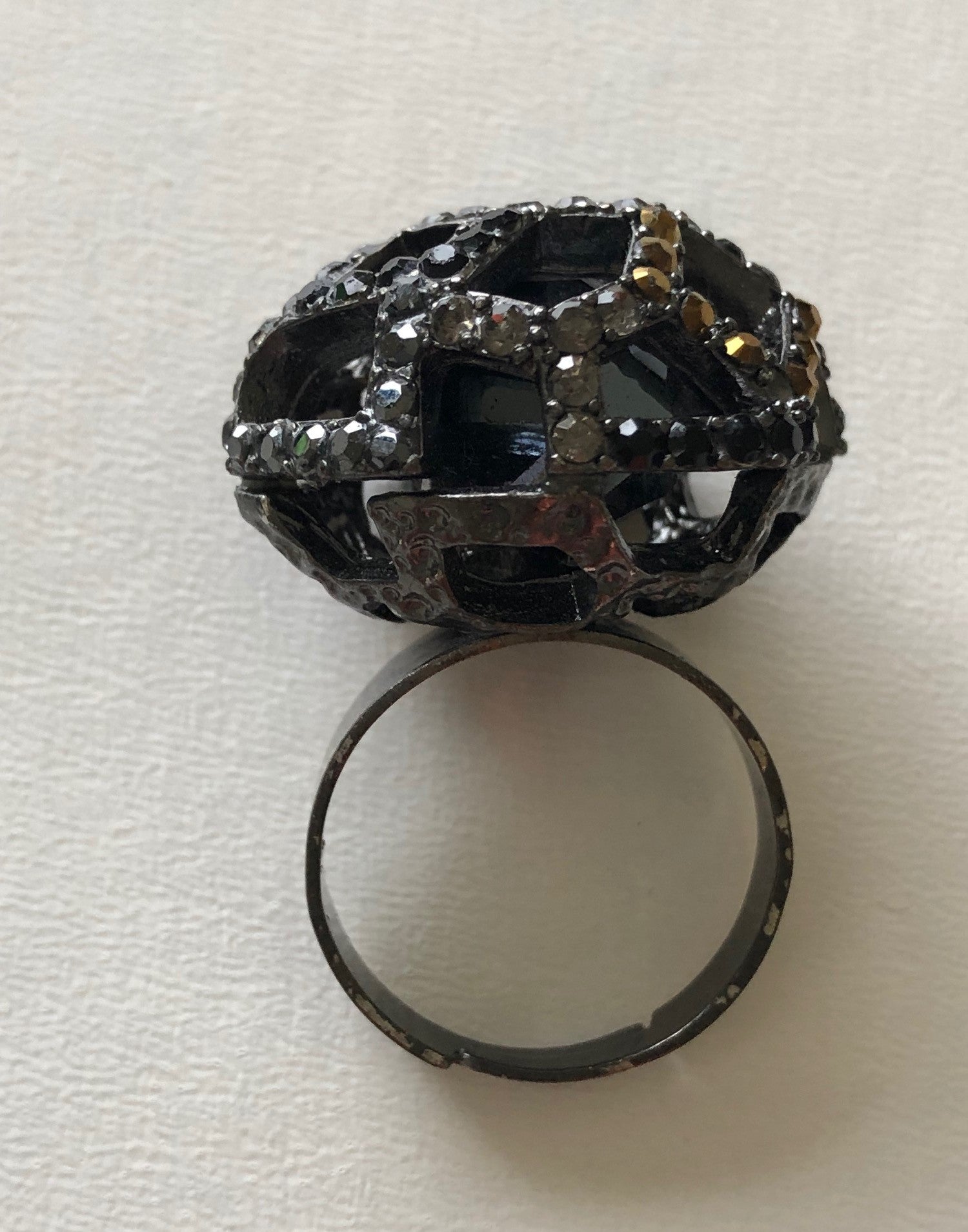 Unique ring - cage encrusted with copper and jet crystals surrounding a copper ball. The ring is adjustable and made from quality nickel-free electroplated brass. Width of cage 29 mm, the height from the bottom base of the ring to the top of the cage 36 mm. The ring size is adjustable.